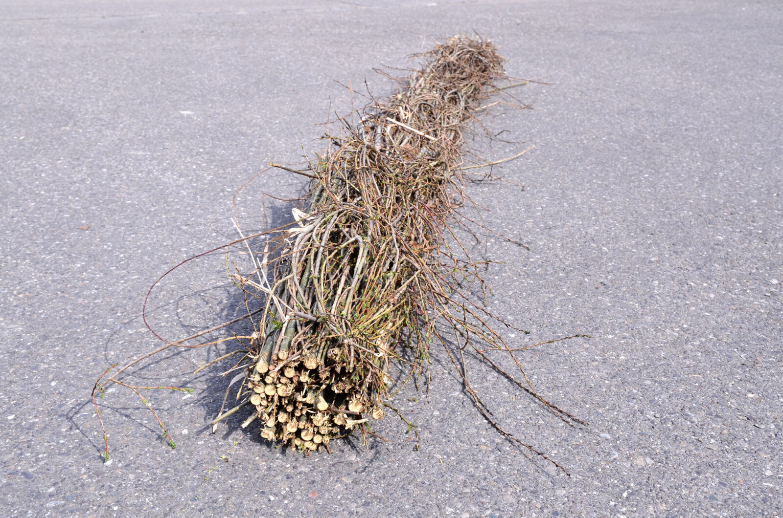 mit 30 % – 80 % Anteil Weiden. Mit Glühdraht, 2.8 mm, im Abstand von ca. 50 cm gebunden. Seitlich geschnitten. Länge +/- 5.0 m, ∅ ca. 30 – 40 cm, Gewicht ca. 45 kg/m